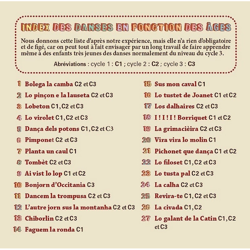 Vint e sèt danças occitanas, causidas dins lo repertòri tradicional o creadas pel grop, per far dançar los mainatges, de 3 a 12 ans.