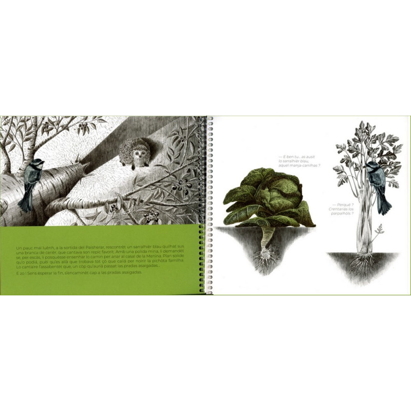E es aital qu'entre viatge de l'eriç e dialògs de plantas, l'album prepausa tot un trajècte per las relacions ecologicas de l'òrt.