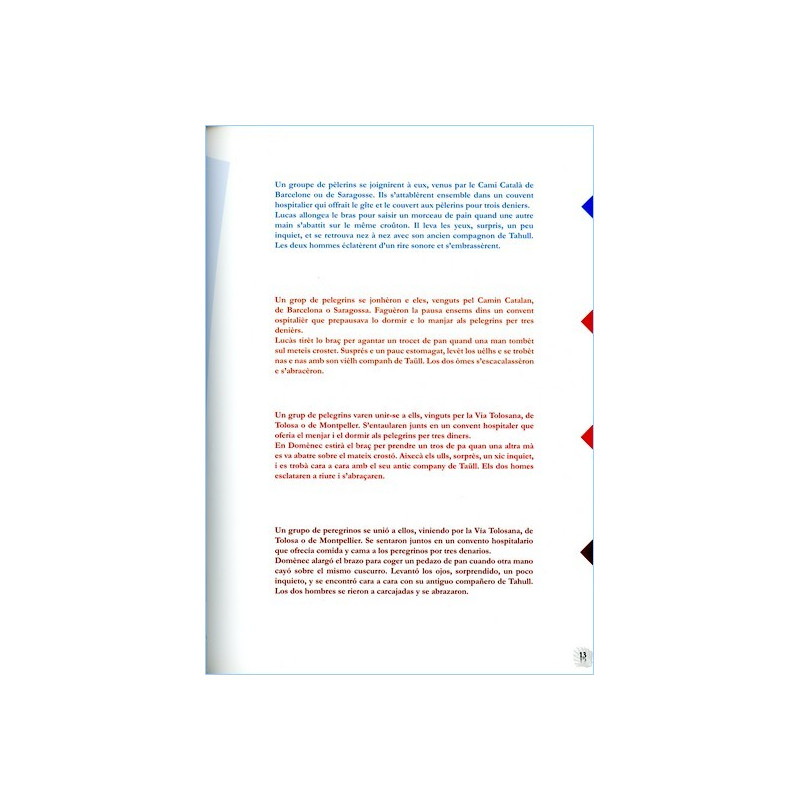 Pour croiser les langues et l’histoire des arts, une histoire en français, occitan, catalan et espagnol. Album illustré de photographies couleur : paysages et oeuvres d'art rencontrés sur le Chemin de Compostelle.