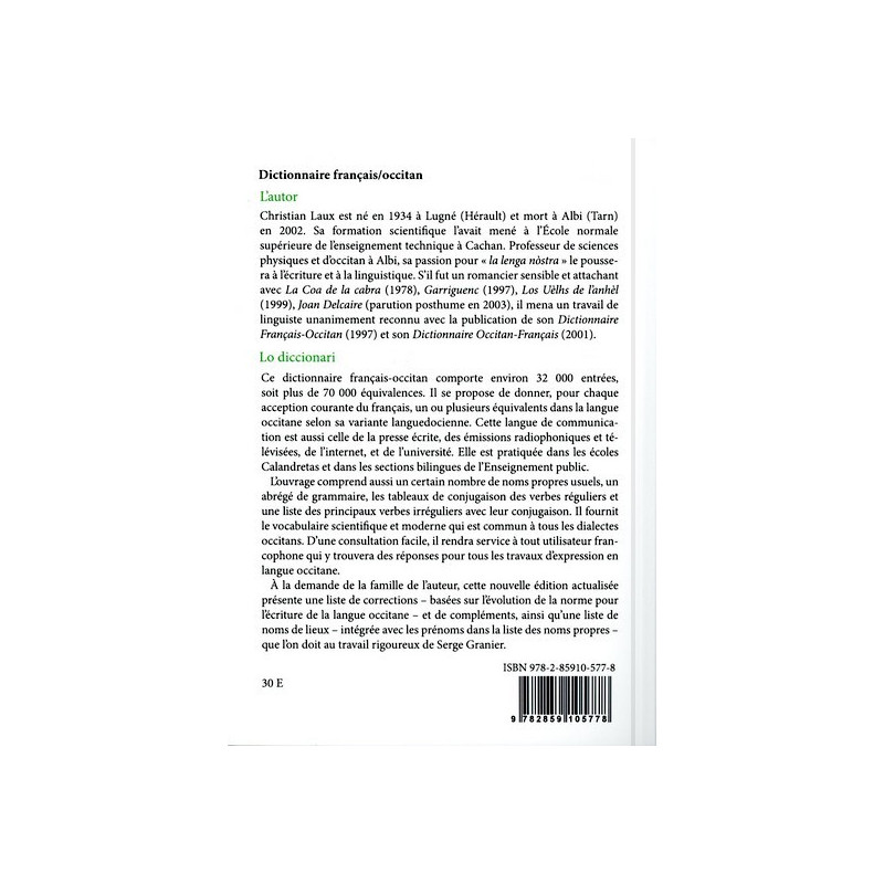 La nouvelle édition, revue et corrigée, d'un dictionnaire de référence pour ceux qui se lancent dans l'écriture de l'occitan languedocien et à qui un lexique ne suffit plus. Ce dictionnaire comporte aussi le vocabulaire moderne correspondant aux techniques et aux savoirs actuels.