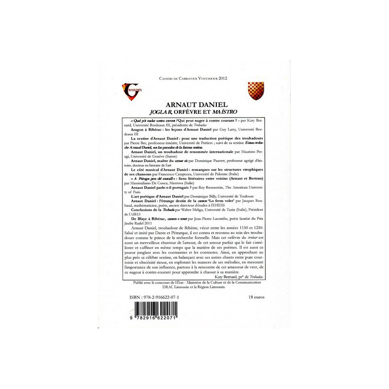 Les actes de la Trobada tenue à Ribérac en juin 2012 : le point sur Arnaut Daniel, troubadour qui était reconnu par ses pairs comme le "prince de la recherche formelle".