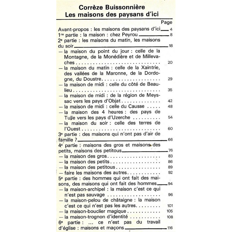 L'ouvrage explore toutes sortes de maisons paysannes : Monédière et Millevache, Xaintrie, pays de Beaulieu et d'Objat, de Tulle et d'Uzerche, mais aussi maisons "de gros et de petits", sans oublier le point de vue des maçons... Voir la table des matières (image 2).
